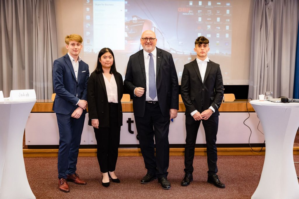 CEO Andreas Matthä zeigte zu Beginn in einer kurzen Präsentation den jungen Techniker*innen die wesentlichen ÖBB Entwicklungen und Zukunftspläne im Personenverkehr, Infrastruktur und Schienengüterverkehr auf, „Bereits jetzt fahren in keinem anderen Land der EU mehr Menschen pro Jahr mit der Bahn, wie in Österreich. Auch beim Güterverkehr sind wir als Nummer 2 in Europa ganz vorne mit dabei.“ betonte Matthä. Im Vor-Coronajahr 2019 nutzen 477 Millionen Reisende die Angebote der ÖBB mit Bahn und Bus bzw. beförderte die ÖBB Rail Cargo Group über 100 Mio. Tonnen/Jahr. Ein wichtiger Punkt in der Diskussion war auch der Klimawandel und die Rolle der Bahn – „Die Bahn ist die Antwort auf die Klimakrise“. Die ÖBB sparen jährlich rund 4,2 Mo. Tonnen CO2 ein. Zur Erreichung der Klimaziele der EU bis 2050 bzw. Österreichs bis 2040 müssen vor allem mehr Güter mit der Bahn transportiert werden. „Wir brauchen eine Verkehrswende. Weniger Straßen- dafür mehr Schienengütertransporte! Schließlich ist die Bahn gegenüber dem Lkw wesentlich nachhaltiger.“ unterstrich Matthä. Damit die Verkehrswende gelingt, investieren die ÖBB in die Infrastruktur so viel wie noch nie und werden bis 2040 die Leistungsfähigkeit auf der Schiene in Österreich verdoppeln. Allein das in der Geschichte Österreich größte Investitionsprogramm von 18,2 Mrd. Euro von 2022 bis 2027 unterstreicht die rot-weiß-roten-Ambitionen; kein Land in der EU investiert derzeit mehr pro Kopf in die Bahn!